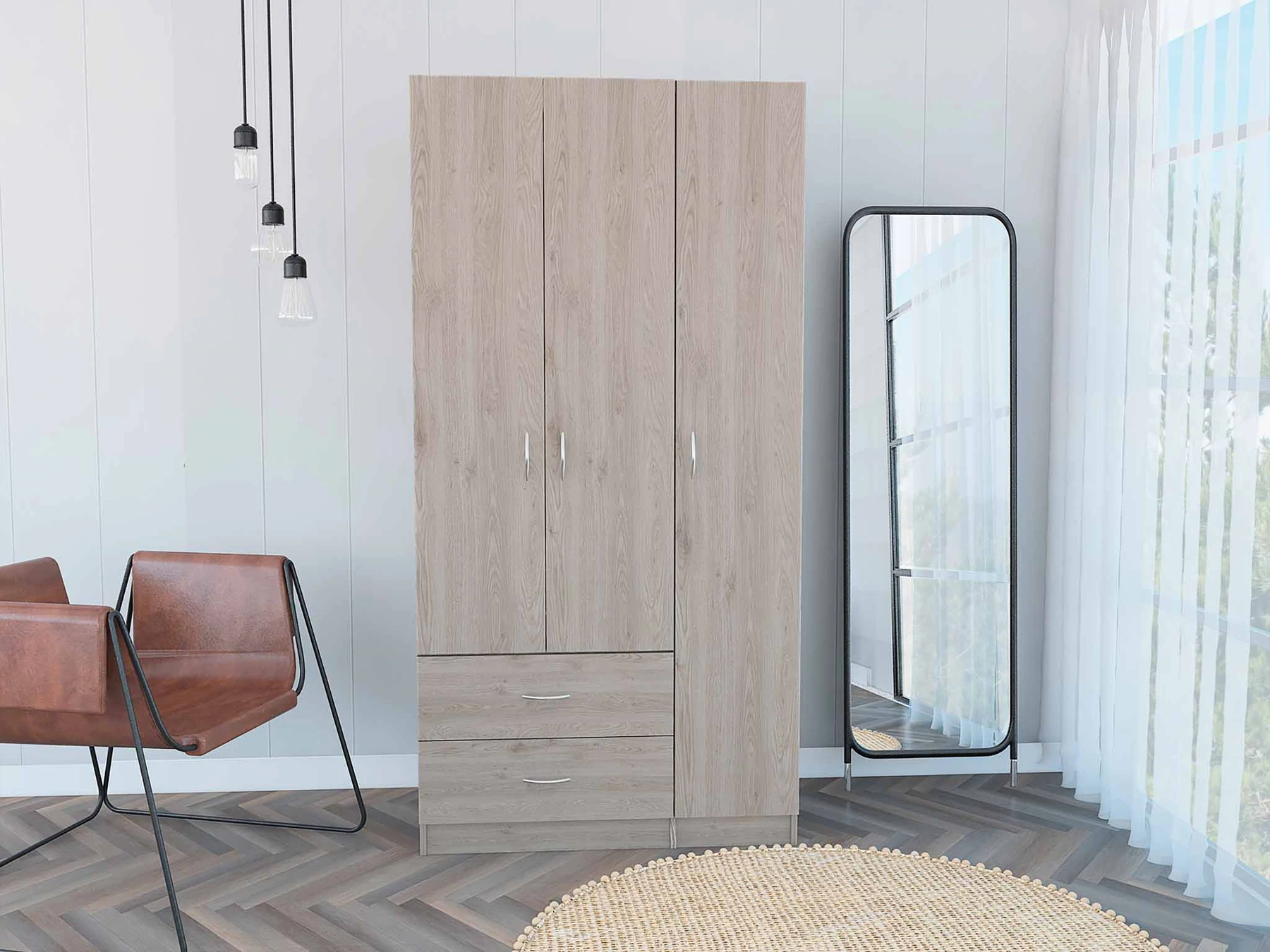 • TUHOME Austral 3 Doors Armoire, Metal Rod, Two Drawers, One Door Cabinet, Two Door Cabinets, Light Grey, For Bedroom