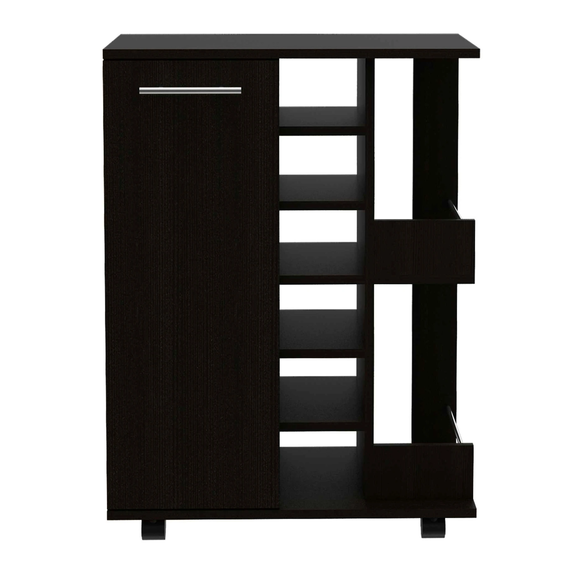 • TUHOME Bar Cart, Two External Shelves, Four Caster Wheels, Six Wine Cubbies, One-Door Cabinet, Countertop, Black, For Living Room