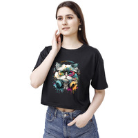 • Elliti Soft Rich Cotton Casual Cat Face Printed Black Half Sleeve | Round Neck | Oversized/Loose Fit | Down Solder | Rainbow Color Printed Crop Top For Women (Size: Xl)