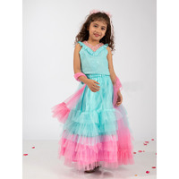 • Elaisha Sleeveless Embroidered & Ruffle Detailed Top With Lehenga & Dupatta Set - Light Blue & Pink