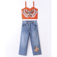 • Elaisha Girls Crop Top With Eye-Catching Butterfly Embroidery And The Jeans With Beautiful Butterfly Patch - Orange & Blue