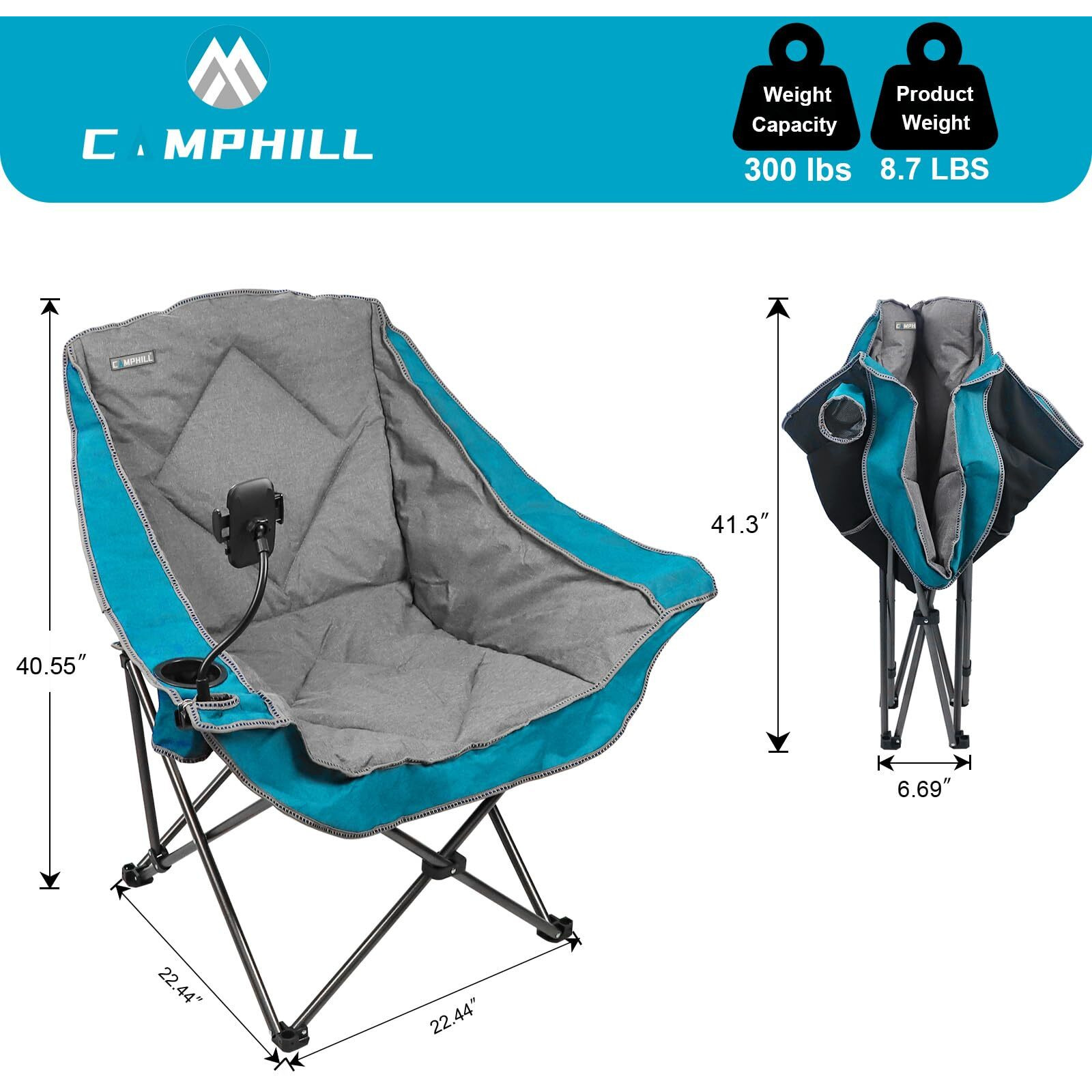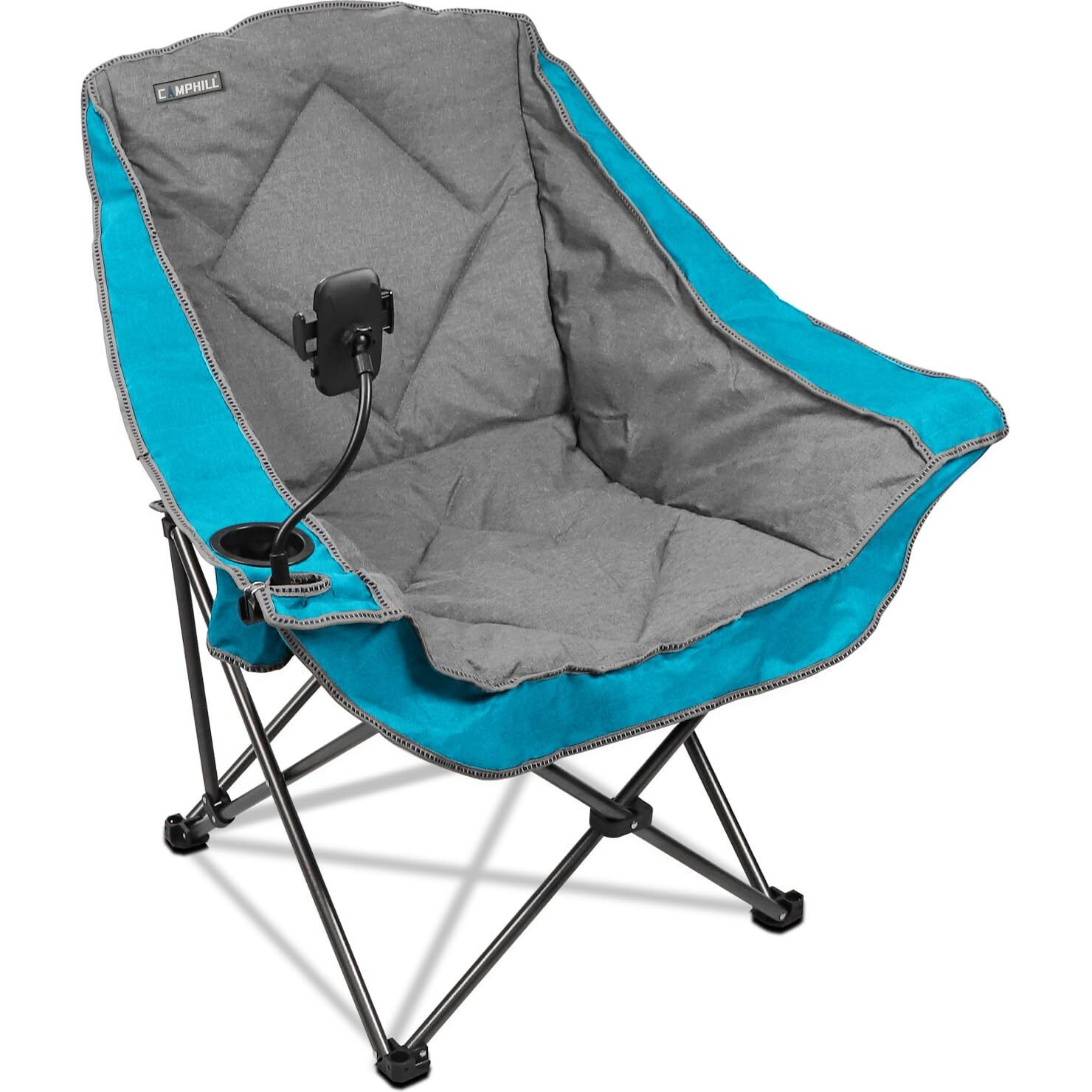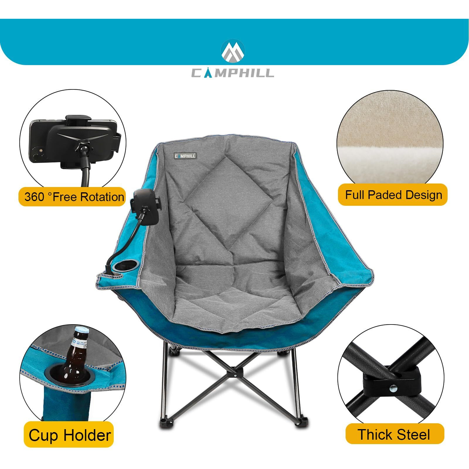 Camphill Folding Camping Chair,Oversized Portable Camping Chair With Cup Holder And Phone Holder,Heavy Duty Padded Lawn Chair For Camping,Tailgates,Beach,And Sports,Lake Blue