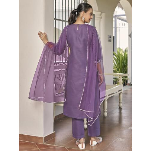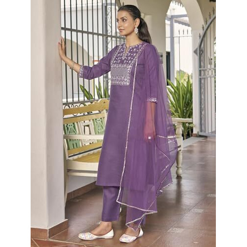 Sanisa Women'S Cotton Blend Embroidery Work Straight Kurta With Pant And Dupatta Set (146Kbd1582Na-Xxl_Dark Lavender)