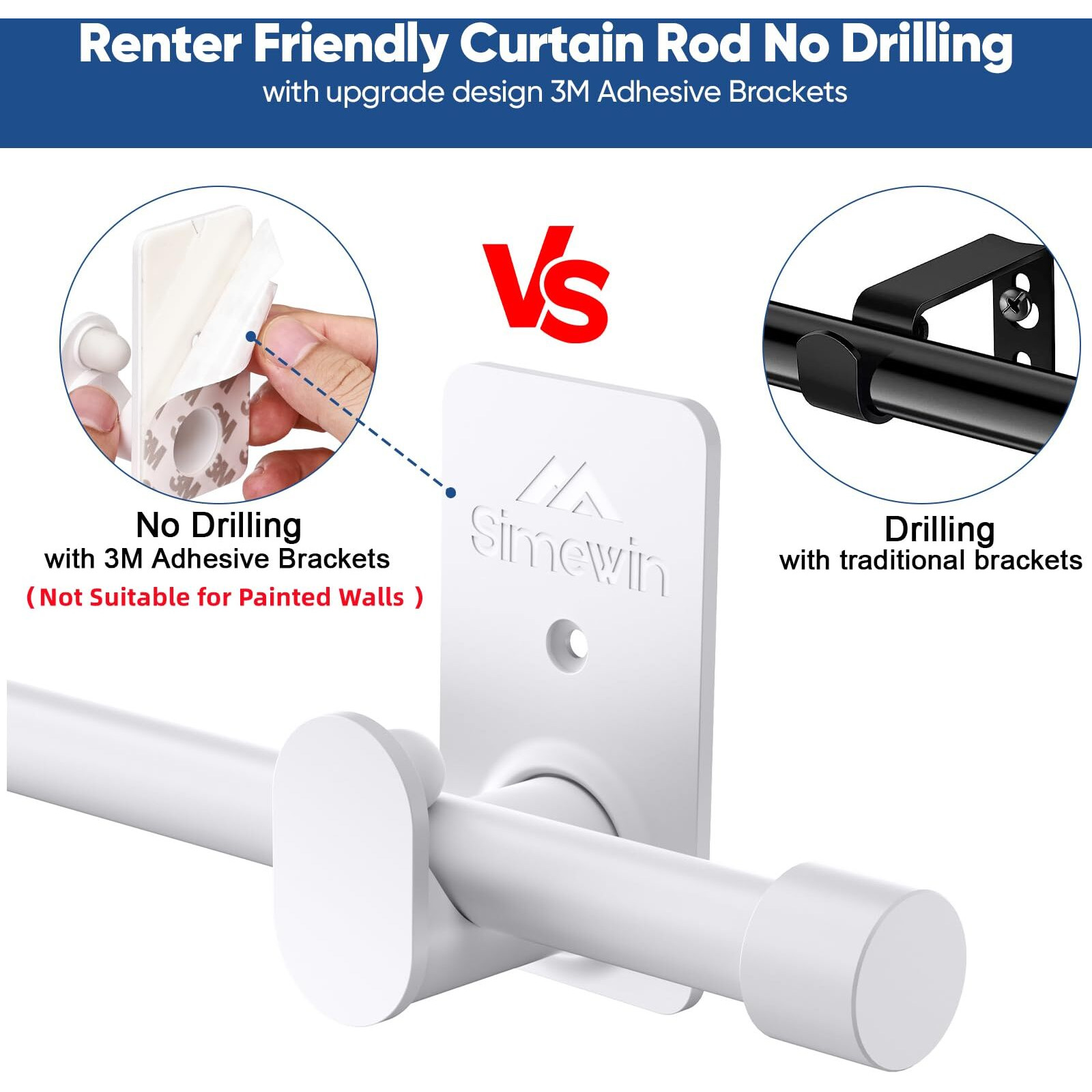 Simewin Curtain Rods No Drilling For Windows 30 To 60 Inches,5/8 Inch Diameter No Drill Small Curtain Rod Set With 3M Adhesive Brackets, White