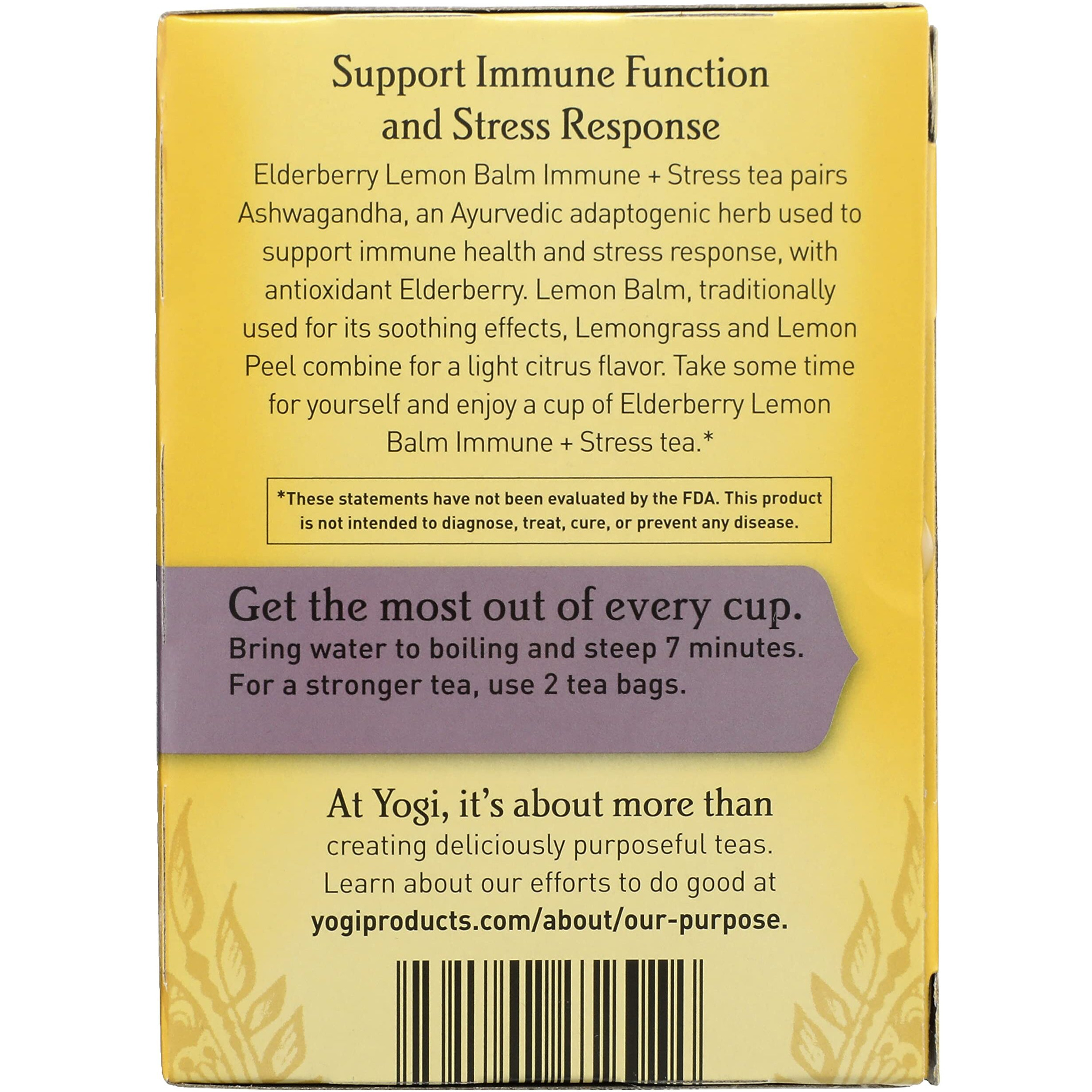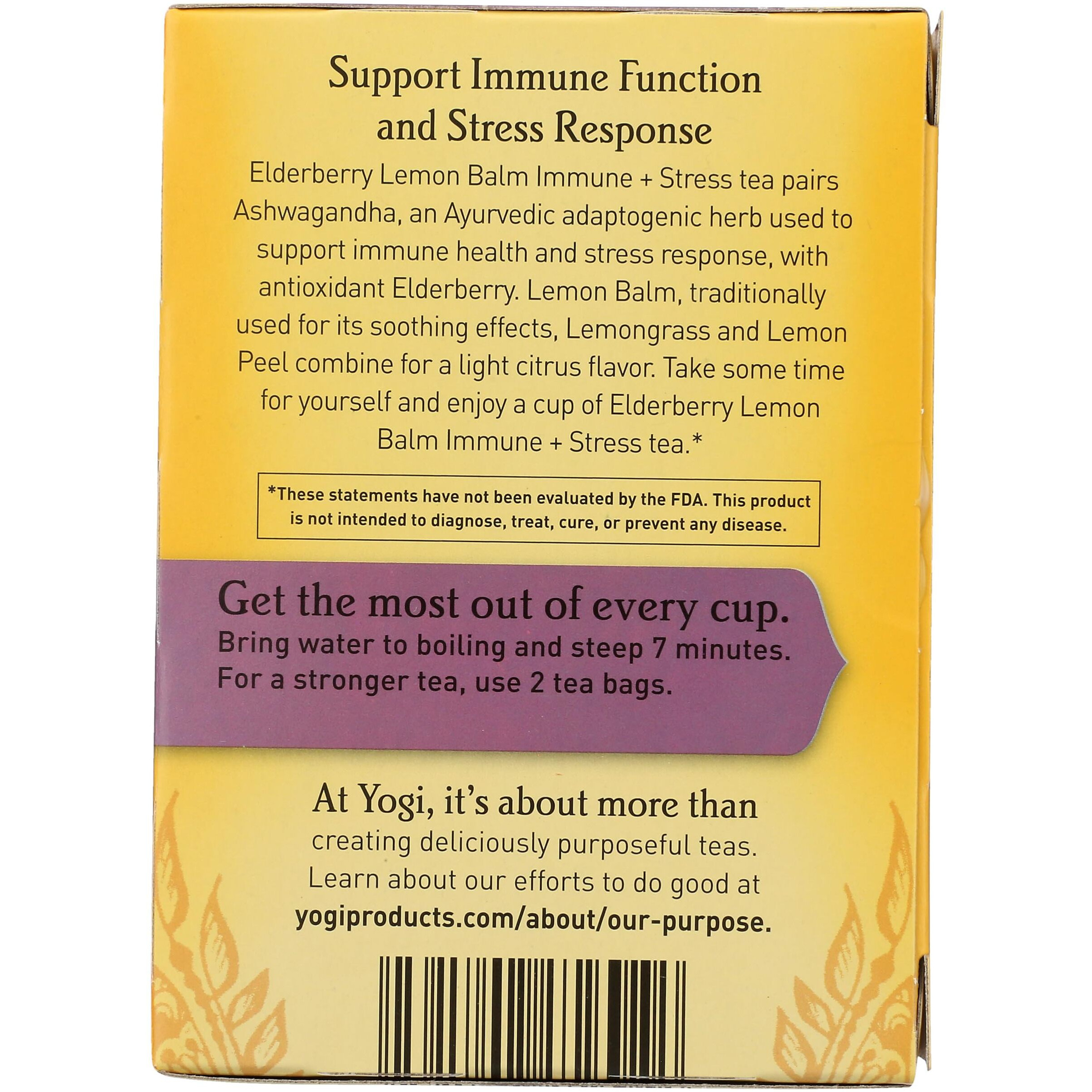Support Immune Function And Stress Response With Yogi Elderberry Lemon Balm Immune + Stress Tea. Yogi Elderberry Lemon Balm Immune + Stress Tea Pairs Ashwagandha, An Ayurvedic Adaptogenic Herb Traditionally Used To Support Immune Health And Stress Response, With Antioxidant-Supplying Black Elderberry. Lemon Balm, Traditionally Used For Its Soothing Effects, Combines With Lemongrass And Lemon Peel To Impart Light Citrus Flavor. Take Some Time To Support Your Well-Being And Enjoy A Cup Of Yogi Elderberry Lemon Balm Immune + Stress Tea.*